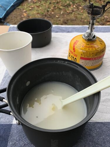 翌朝、小雨が降る中で朝食の準備。 アウトドア初心者なので、かんたんなレトルト食品で。 まず初めにまだ寝ぼけている脳をシャキッとさせたいから、 パーコレーターでお湯をわかし、コーヒーをいれるところから。 パーコレーターの本来の使い方は無視して、…
